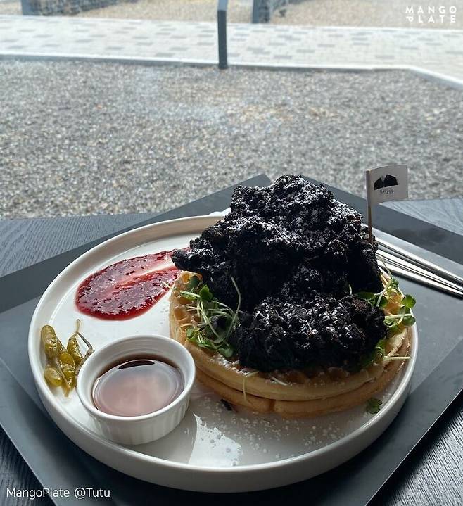 이곳에 방문하면 '묵리플'은 필수 메뉴 중 하나! 묵리459 건물을 형상화해 만들었다고 하는데요. 와플 위에 치킨이 올라가 달콤하면서도 짭조름한 맛이 중독성 있어요.