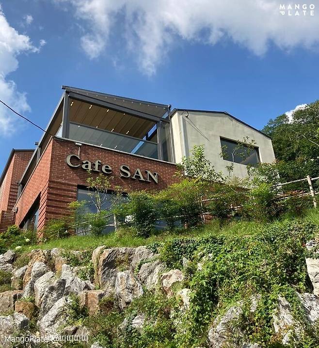 1,2층으로 이루어진 카페 산은 카페에서 바라보는 풍경이 예쁘기로 유명한 곳이에요. 1층에는 넓은 마당이 있고, 2층에는 넓은 창을 통해 풍경을 바라볼 수 있어 명당자리 중 하나예요.