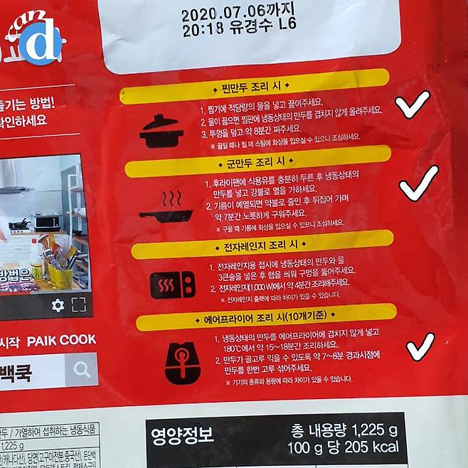 찐만두는 8분, 군만두는 7분, 에어프라이어만두는 20분이 걸리네요.