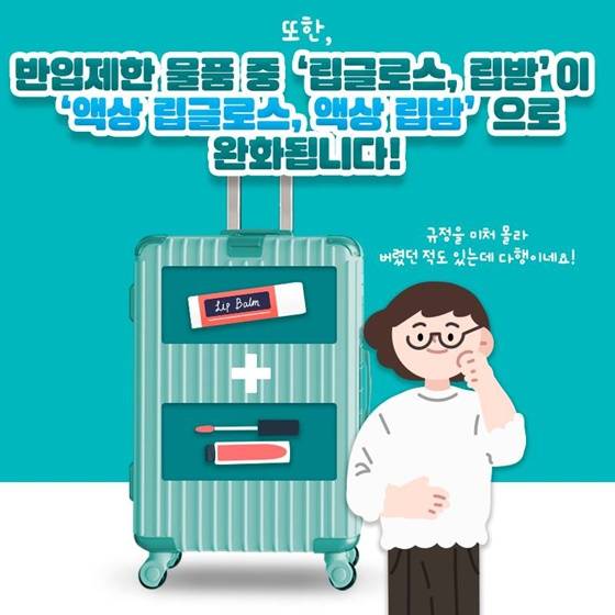 또한, 반입제한 물품 중 ‘립글로스, 립밤’이 ‘액상 립글로스, 액상 립밤’으로 완화됩니다!