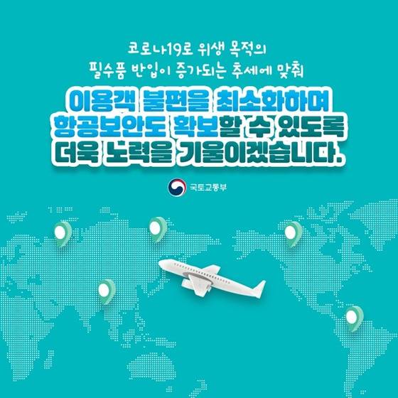 코로나 19로 위생 목적의 필수품 반입이 증가되는 추세에 맞춰 이용객 불편을 최소화하며 항공보안도 확보할 수 있도록 더욱 노력을 기울이겠습니다.