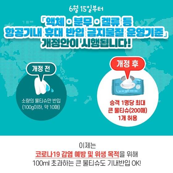 * 의료 목적 물티슈 제외 물티슈는 액체류로 취급되어 100ml 초과 액체류 기내반입 제한 규정의 적용을 받았기 때문! 6월 15일부터, 액체·분무·겔류 등 항공기내 휴대 반입 금지물질 운영기준개정안이 시행됩니다! - 개정 전 : 소량의 물티슈만 반입 (100g이하, 약 10매) - 개정 후 : 승객 1명당 최대 큰 물티슈(200매) 1개 허용 이제는 코로나19 감염 예방 및 위생 목적을 위해 100ml 초과하는 큰 물티슈도 기내반입 OK! 보안검색대도 걱정 NO! 보안검색 과정에서 해당제품에 대한 압수·폐기 과정이 사라져 여객 편의가 향상됩니다.