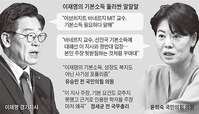 이 지사는 지난 4일 유승민 전 국민의힘 의원이 자신의 기본소득을 비판하자 “기본소득이 필요하다는 바네르지 교수와 사기성 포퓰리즘이라는 유승민 의원 모두 경제학자라는데 어느 장단에 맞춰야 할까요”라고 했다. 이 지사가 언급한 바네르지 교수는 아내 에스테르 뒤플로 MIT 교수와 함께 2019년 빈곤 퇴치를 위한 실험과 연구로 노벨 경제학상을 받았다.