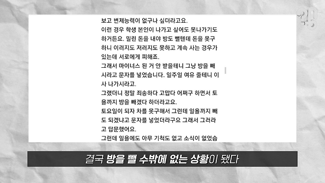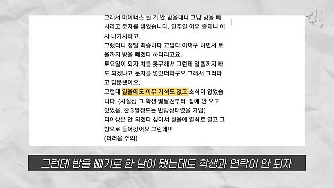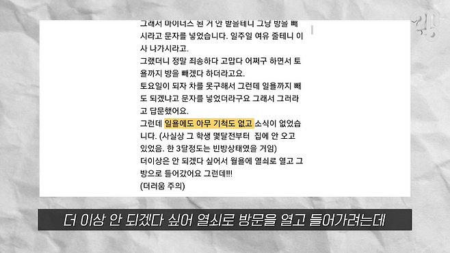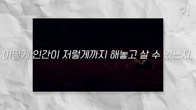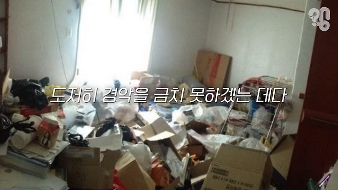 “0340 우리가 상식적으로 받아들여질 수준의 / 더러움이 아니라 도저히 살 수 없을 공간처럼 / 위생관리가 전혀 안 되는 건 기본적으로 우울증이 있다고 봐야죠” 라고 설명했다.