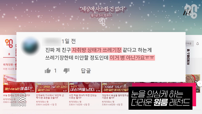 유튜브 댓글로 “집을 쓰레기장처럼 해놓고 사는 친구가 있는데 이거 병 아닌지 취재해 달라”는 의뢰가 들어와 취재했다.