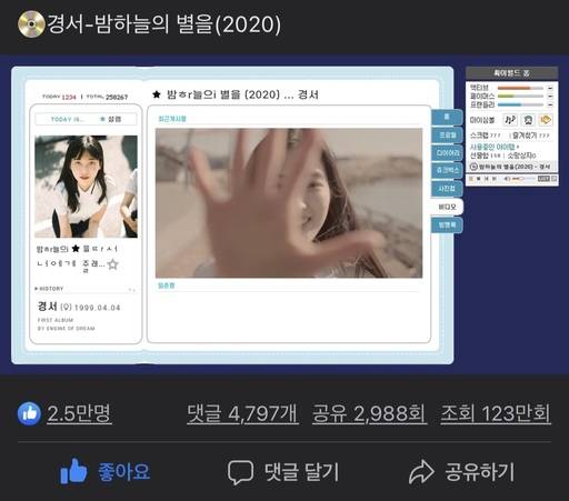 이 노래는 당시를 보낸 20∼30대, 또는 40대에게 특별하다. ‘추억’ 그 자체다. 그래서 가끔 이 노랫말이 들리면 2010년, 당시를 회상하곤 한다. 그런 노래가 11년이 지난 최근 급부상하고 있다. 엄밀히 말하면 2010년 ‘밤하늘의 별을’이 아니다. ‘경서’라는 신인가수가 다시 부른 2020년 버전이다.