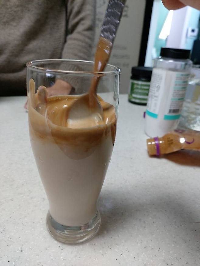 완성된 원액을 부어주면 '달고나 커피' 완성입니다.