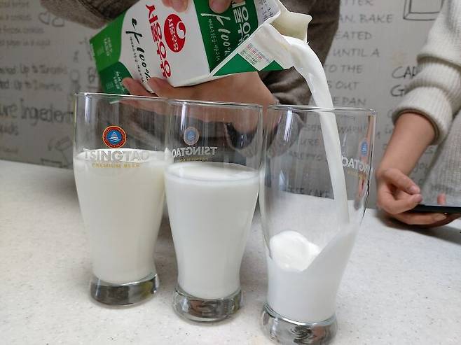 예쁜 투명 유리컵에 우유를 따라주고요.