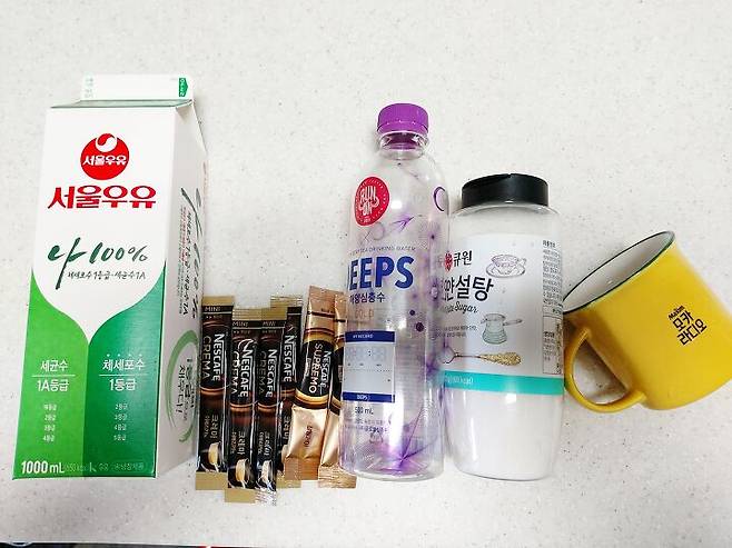 준비물은 우유, 커피, 설탕 그리고 페트병 하나가 필요합니다.