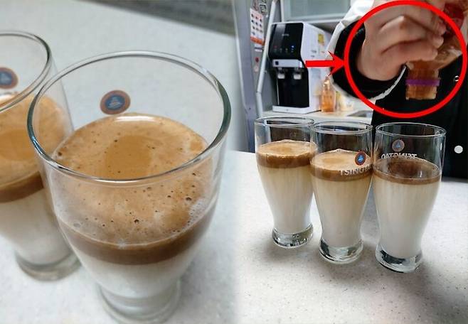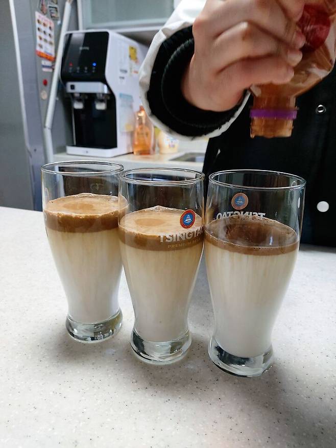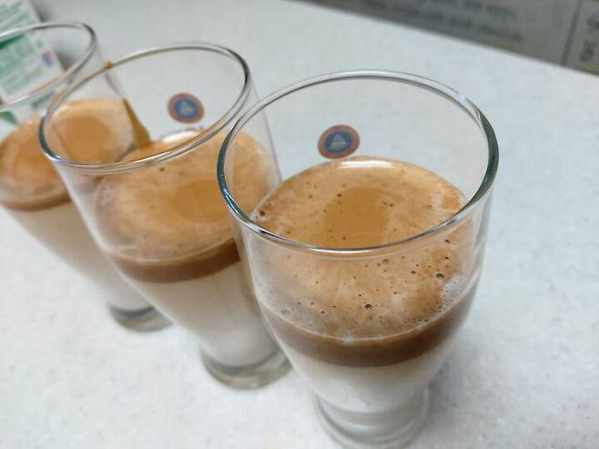 완성된 원액을 부어주면 '달고나 커피' 완성입니다.