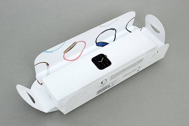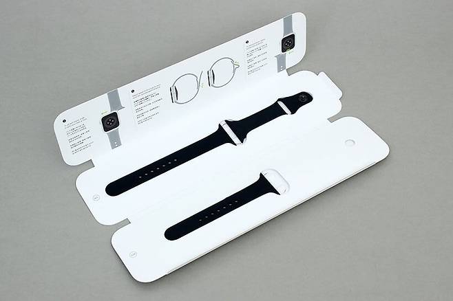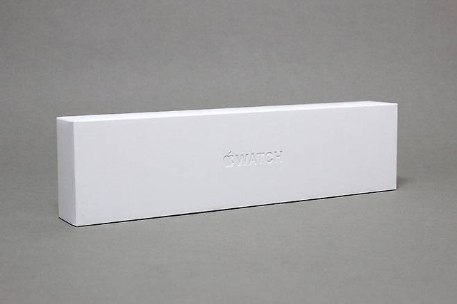 애플 워치도 시리즈별, 모델별로 조금씩 다른 패키지를 사용해왔는데, 현재의 패키지는 가로로 긴 박스 형태를 사용하고 있다. 박스의 중앙에는 애플의 사과 로고와 WATCH라는 글자가 음각으로 새겨져 있어서 고급스러움을 더하고 있다.