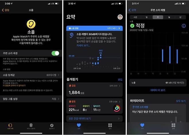 애플 워치 시리즈6에서는 주변 소음을 측정할 수 있다. 주변 소리 측정 기능을 활성화하고 소음 임계값을 설정하면 주변 소음이 기준 이상으로 높아졌을 때 알림 기능으로 사용자에게 알려준다. 백그라운드에서 측정된 소음은 하루 종일 계속 측정되며, 스마트폰의 앱을 통해 저장된 소음 레벨을 언제든지 확인할 수 있다.
