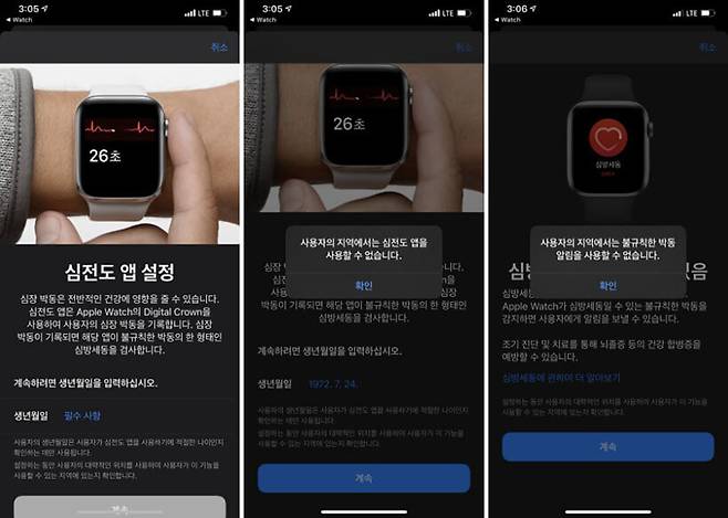 애플 워치 시리즈6에는 심전도 측정 기능과 불규칙한 심박 알림 기능이 있는데, 아쉽게도 국내에서는 이 기능을 사용할 수 없다.