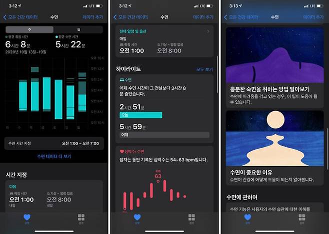 애플 워치 시리즈6를 취침 시에 착용하면 수면 측정도 가능하다. 측정된 정보는 워치에서도 확인이 가능하며, 스마트폰 앱에서는 수면 기록과 잠자는 동안의 심박수 그리고 수면에 대한 건강 정보도 확인할 수 있다.