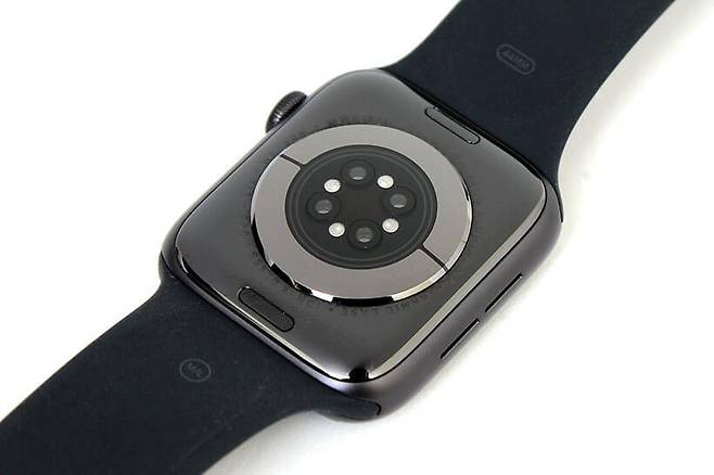 뒷면은 이전 모델과 제법 다르게 바뀌었다. 광학 심박 센서가 가운데 있고 가장자리에 전기 심박 센서가 있던 시리즈5와는 달리, 네 개의 포토다이오드와 네 개의 LED 클러스터로 굉장히 복잡해졌다.