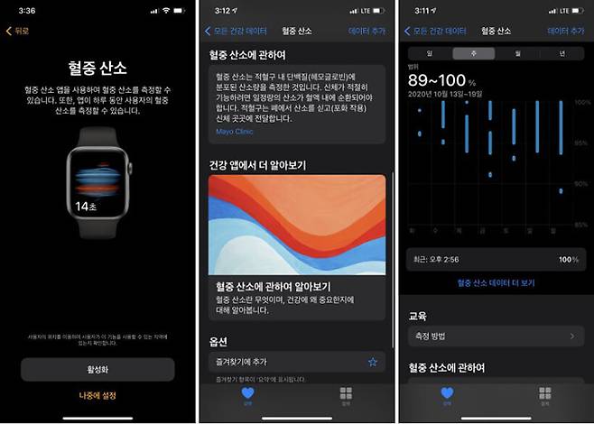 애플 워치 시리즈6에는 혈중 산소 측정 기능이 새롭게 추가되었다. 본체 후면에 있는 네 개의 포토다이오드와 네 개의 LED 클러스터를 통해 혈중 산소를 측정하는데, 주변 소음과 마찬가지로 상시 측정된 혈중 산소 농도를 앱에서 자세히 확인할 수 있다.