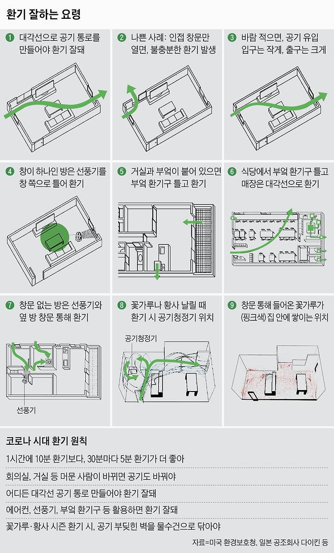 외부 공기가 안으로 빠른 속도로 들어와 원래 있던 공기를 다른 창 밖으로 밀어내야 환기 효과가 크다. 따라서 공기 유입구와 배출구, 두 개의 창을 열어야 한다. 이때 대각선 방향으로 두 개의 창을 열어 두는 게 실내 공기 전체를 효율적으로 교체할 수 있다. 인접한 두 개의 창만 열어서 환기하면 들어온 공기 바로 빠져 나가서, 안쪽 대부분의 공기는 그대로 남아 있게 된다<그래픽 참조>.