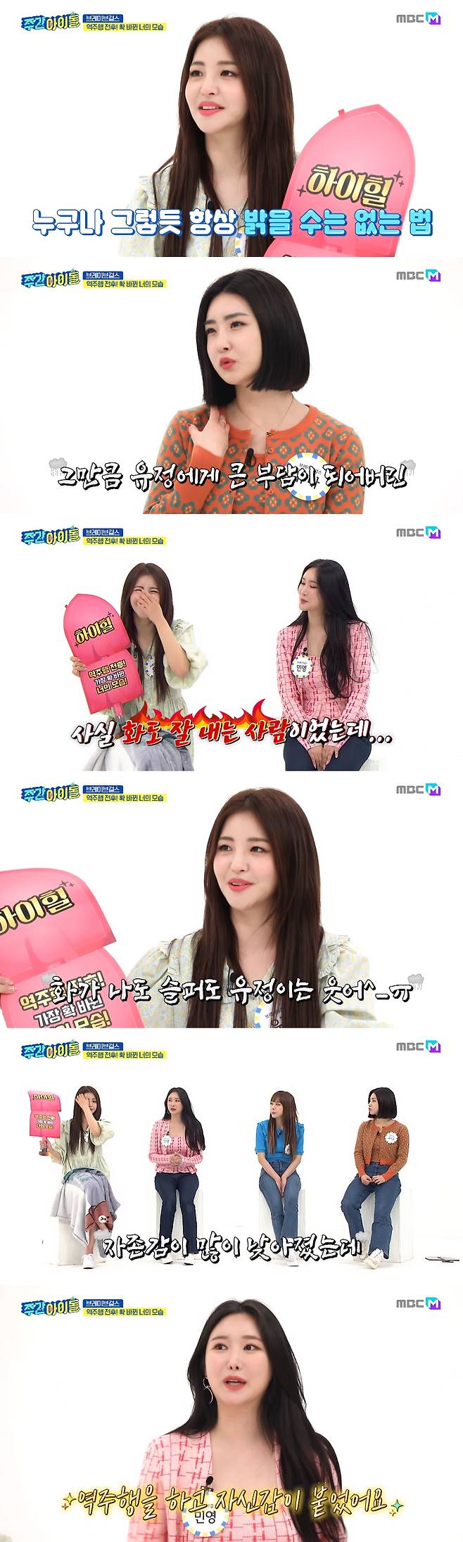 이를 듣고 있던 민영은 "멤버들이 의기소침했는데, 역주행 후 자신감이 붙어 보기 좋다"며 힘을 불어넣었다.