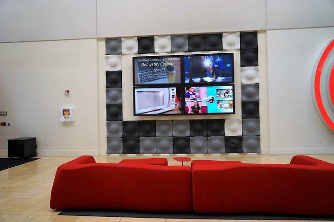 사무실에는 유튜브의 현재 인기 영상이 상영되는 화면이 곳곳에 걸려있습니다. 크리에이터들의 영상은 물론 제작사들의 방송 영상, 뮤직비디오, 게임 영상, 애니메이션 등 유튜브 플랫폼을 상징하는 다양한 포맷의 영상이 재생되고 있었습니다.