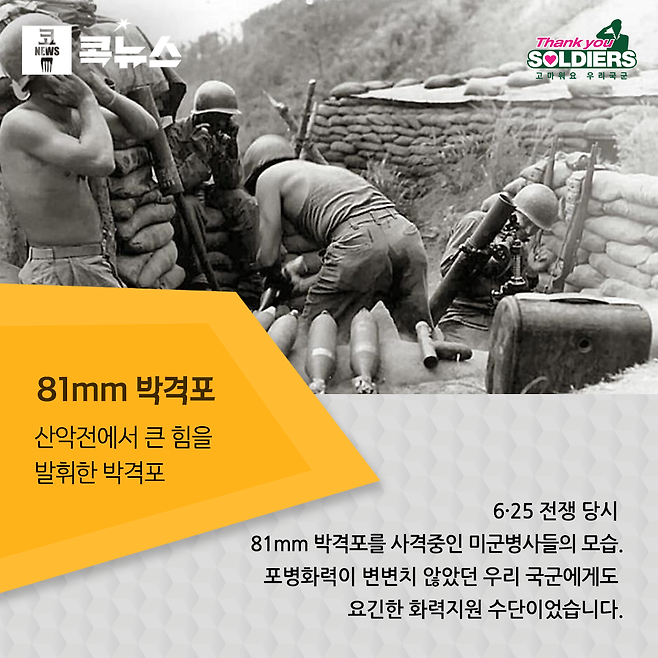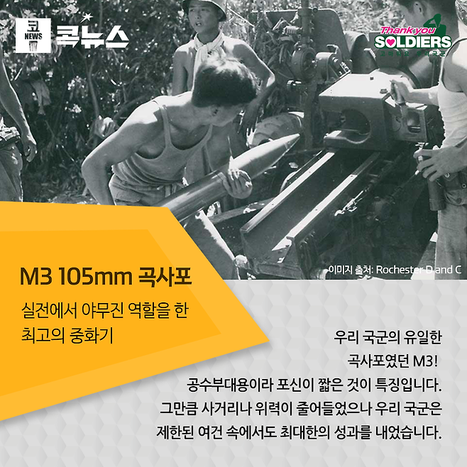 6.25 발발 당시 북한군이 보유한 야포에 비해 국군의 포병화력은 사거리나 화력 모두에서 절대 열세였다. 하지만 일방적으로 밀리던 전쟁 초기에도 국군 포병부대는 그야말로 놀라운 분투를 펼쳤고, 국군에 제대로 된 포병전력이 없을 거라 생각한 북한군을 매우 당황하게 만들었다. 특히 창군 당시 국군이 보유한 최고의 중화기였던 105mm M3 곡사포는 가장 암울했던 시기에 신화를 썼던 국군의 자부심이었다. M3 곡사포는 한국전쟁 발발 당시 국군이 보유한 최대 중화기였다. 사실 6.25 직전 국군수뇌부는 북한군의 전력 증강이 위험하다고 판단하여 수차례에 걸쳐 충분히 맞설 수 있는 전차와 야포 그리고 전투기의 공급을 미국에 요청하였다. 하지만 미국은 북한의 남침 능력을 오판하여 우리의 요청을 거절하였다. 이 때문에 포병 장비도 당시 미군의 표준이라 할 수 있는 155mm 곡사포는 고사하고 보병 지원용으로 대량 사용하던 M101 105mm 곡사포도 지원하지 않았다. 대신 국군에게 2.36인치 로켓포와 57mm 대전차포, 그리고 M3를 공급하여 주었다. M3는 공수부대용 곡사포로써 포신이 짧아 당시 여러 나라에서 보편적으로 쓰이던 M101 105mm 곡사포에 비해 사정거리가 거의 절반으로 줄어든 화포였다. 하지만 국군은 이를 해방된 내 나라를 지켜 주는 소중한 자산으로 여겨 귀하게 다루었고, 실전에서 야무진 활약을 했다.