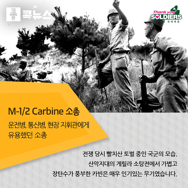 M-1/2 카빈 역시 제2차 세계대전 당시 미국에서 개발된 소총이다. M-1은 우수한 소총이긴 했지만 비교적 크고 무거워 운전병이나 통신병, 현장 지휘관 등에게는 부담스러운 소총이었다. 따라서 미군은 크기가 작고 반자동 사격이 가능한 M-1 카빈을 개발해 일선에 보급하게 된다. 6·25전쟁에서도 M-1이 동양인들에게 다소 크고 무거웠던 반면, M-1 카빈은 동양인에게 이보다 더 좋을 수 없는 크기와 무게의 소총이었다. M-1 카빈 모델은 15발 탄창을 사용했으나, 6·25 전쟁 때부터 사용된 M-2 카빈은 완전자동사격이 가능해 30발 탄창을 사용하였다.