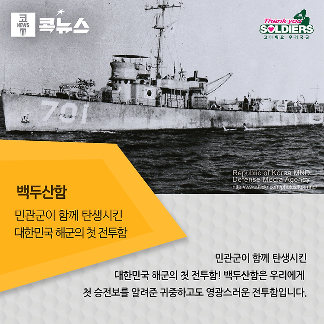 1949년에 대한민국 해군이 창설되었지만, 제대로 된 전투함이 단 한척도 없었던 당시 우리 해군은 자발적으로 ‘함정건조 거출위원회’를 결성했다. 간부에서부터 사병까지 십시일반으로 기금을 조성하였고, 일부 수병들은 고철이나 폐품을 팔아 보탰다. 심지어 간부 부인들은 삯바느질로 기금마련을 도울 정도였다. 이렇게 해서 4개월 만에 1만 5천 달러의 기금이 조성되었고, 이에 감동한 우리 정부는 4만 5천 달러를 지원, 마침내 미국 해양대학교의 실습선인 퇴역 초계정 ‘화이트헤드 소위’호를 인수한다. 배를 인수하러 갔던 장교 15명은 경비절감을 위해 약 두 달간 배에서 숙식하며 엔진만 멀쩡했던 배를 직접 수리했다. 이윽고 1949년 12월 26일, 대한민국 해군의 첫 전투함인 백두산함(PC-701)이 탄생하였다. 백두산함은 귀국하면서 하와이에 들러 3인치 주포를 장착하였고, 다시 괌에서 포탄 100발을 구입해 1950년 4월 10일 진해항에 입항하였다. 그리고 불과 두 달여 후 6·25전쟁이 발발 한다. 1950년 6월 25일 오전 10시경, 출격을 명받고 동해로 향하던 백두산함은 1,000톤급의 괴선박과 조우한다. 이 배는 당시 전투함이 없었던 한국 해군의 약점을 이용해 부산을 점령, UN군의 지원을 차단하고자 600여명의 게릴라를 태우고 잠입 중인 북한의 무장수송선이었다. 이윽고 1시간동안 백두산함은 자기 덩치의 두 배가 넘는 적함과 격렬한 전투를 벌였고, 마침내 적함을 격침 시킨다. 미국의 역사학자 노만 존슨은 ‘백두산함의 승리는 6·25전쟁의 승패를 가른 중요한 분수령 이었다’고 평가했다. 민관군이 함께 탄생시킨 대한민국 해군의 첫 전투함, 백두산함은 우리에게 첫 승전보를 알려준 귀중하고도 영광스러운 전투함이다.