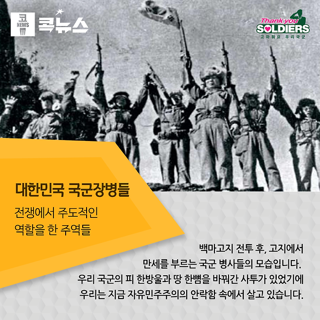비극적인 동족상잔의 전쟁 6·25에서 그 무엇보다도 결정적인 무기는 바로 우리 국군용사들이었다. 전쟁 직전, 10만이 조금 넘었던 국군은 최악의 상황 속에서 기적적으로 버텨내었고, 이후 UN군의 도움을 받아 무장과 훈련수준이 충족되자 전쟁에서 주도적인 역할을 하였다. 전쟁 종반에 서부전선은 UN군이, 동부전선은 국군이 담당하였는데, 현재의 휴전선을 보면 알 수 있듯이 서쪽에 비해 동쪽이 훨씬 북으로 올라가 있다. 백마고지전투 등 그 유래를 찾아볼 수 없는 격전지에서 우리 국군은 피한방울과 땅 한 뼘을 바꿔가며 사투를 벌였고, 그 결과 무려 14만에 달하는 전사자가 6·25 전쟁동안 발생했으며, 그 덕분에 우리는 지금 자유민주주의의 안락함 속에서 살고 있다. 현재 대한민국 국군은 세계 10위권 안에 드는 막강한 전투력을 자랑하고 있으며, 북한의 그 어떤 군사적 도발도 조기에 분쇄할 수 있는 강군으로 성장했다.