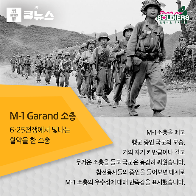 미국에서 개발된 M-1 Garand 소총은 세계 최초로 대량배치에 성공한 반자동 소총이다. 제2차 세계대전에서 대활약했으며, 6·25전쟁에서도 역시 빛나는 활약을 했다. 우리 국군은 전쟁 개시 전부터 M-1을 보유하고 있었고, 전쟁 발발 후에는 미국의 지원으로 전군에 배치되었다. 북한군 병사가 5연발 볼트액션 방식의 소련제 모신나강 소총을 사용한데 반해, 우리 국군이 사용한 M-1은 8연발의 반자동방식이었기 때문에 보병 간 전투에서 압도적인 화력의 우위를 점할 수 있었다. 6·25전쟁 이후 미국은 M-1을 개량하여, 20연발 탄창을 장착하고 완전자동사격이 가능한 M-14를 제식소총으로 채용해 월남전에 사용했다. 우리 국군도 60년대 말까지 M-1을 사용했으나, 월남파병 이후 점차 M-16으로 교체되었다.