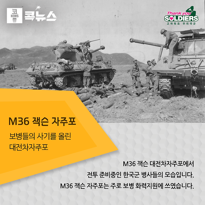 M36은 본격적인 전차가 아닌, 엄밀히 말해 대전차 자주포이다. 하지만 전차가 아쉬웠던 한국군 입장에서는 소중한 존재였다. 게다가 화력만큼은 당시 미국의 주력전차인 M26 퍼싱과 사실상 동일했으며, 구경도 90mm라 지원 포격용으로도 요긴했다. 1953년 1월부터 정전 때까지 53전차중대 3소대장으로 M36 경전차를 몰고 전장을 누빈 김봉기(金鳳起·75·갑종24기)예비역 대령은 “보병을 지원하기 위해 우렁찬 굉음을 울리며 M36 경전차를 몰고 가서 90mm 주포를 사격하면 보병들의 사기가 오르는 것이 눈에 보일 정도였다.”고 회상했다. 그는 “당시 M36은 주로 소대급 단위(전차 5대로 구성)로 실전에 투입돼 보병의 돌격전에 기동 간 화력지원을 하는 형태로 운용됐을 뿐 제2차 세계대전 당시 유럽과 같이 대규모 전차전을 벌인 사례는 없다”고 설명했다. 이 당시에는 이미 북한군에 기갑전력이란 것이 남아있지 않았기 때문이다. 한국 육군에서는 1959년 퇴역했으며 이후 상당 기간 전방 지역 고지에서 고정포로 운용됐다.