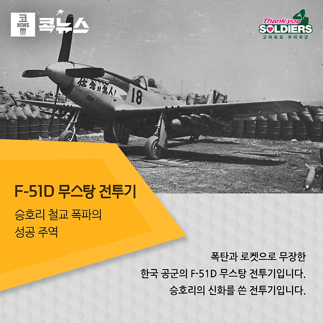 2차 대전을 통해 최고의 전투기로 평가되었던 미국의 「노스 아메리칸 F-51D 무스탕」. ‘하늘의 캐딜락’이라고 불리며 태평양전쟁에서는 이오지마에서 일본 본토 폭격에 나서는 보잉 B-29폭격기의 호위기로서 또 지상공격기로서 많은 활약을 했다. 전후 막이 오른 제트시대의 문턱에서 거의 폐기 처분될 운명이었으나 1950년 한국전쟁의 발발로 다시 현역에 복귀했다. 당시 아시아지역의 미 공군은 필리핀을 위시한 각지에 주둔 하고 있던 부대의 프로펠러전투기들을 제트전투기로 대체하는 중이었다. 10 기의 T-6 텍산 연습기와 12기의 연락기가 공군 전력의 전부였던 한국은 전쟁 발발 직후 미국에 긴급지원을 요청, 10기의 무스탕 전투기를 지원받아 공군의 주력으로 삼았고 동시에 미 공군은 한국 공군에 대한 전력 확충계획인 ‘바우트 원’ 작전을 진행하여 전쟁 기간 중 한국 공군의 전투력 향상과 함께 독자적인 작전을 수행할 수 있게 했다. 특히 미 공군도 성공하지 못한 승호리 철교 폭파를 성공한 것은 물론, 평양 대공습과 전술공군작전 중에서도 가장 위험한 근접항공지원을 통해 351고지 작전을 성공적으로 이끌었다. 이렇게 미 공군의 지원 아래 한국 공군은 전쟁기간동안 북한군에 대한 괄목할만한 작전을 수행했고, 많은 희생이 따랐음에도 100회 이상 출격한 조종사들이 수두룩할 정도로 비약적인 발전을 했으나, 우리 공군의 제트기화는 전쟁 후에나 실현되었다.