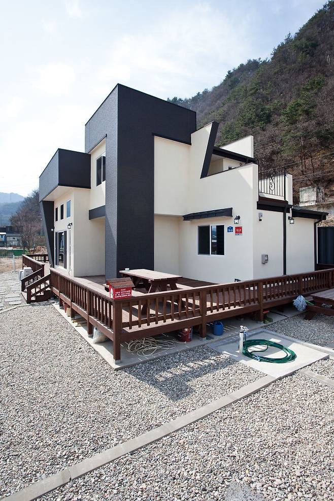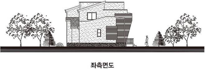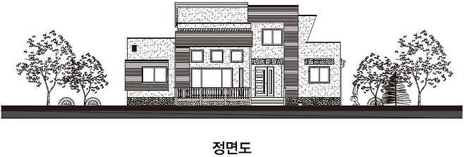 주택은 3열로 조성한 단지 북서쪽 끝에 있다. 사각형 대지에 101.88㎡(30.82평) 건물을 좌측 뒤에 앉히고 우측에 탁구대를 갖춘 운동시설을 별도로 설치했다. 정면에서 본 주택은 밝은 바탕에 어두운 세라믹 사이딩을 몰딩처럼 감싸 시각적 안정감을 준다. 경사지붕 상부까지 올린 가벽을 예각으로 처리해 보는 각도에 따라 단순하거나 역동성이 느껴지도록 다이내믹한 요소도 가미했다.