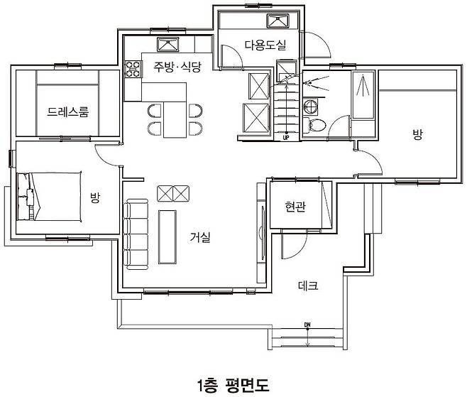 평면은 편안한 생활에 중점 두고 주택 중심에 공용 공간을 배치해 가족들의 접근성을 편리하게 했다. 최대한 사생활을 존중하기 위한 공간 설계도 돋보인다. 외부에서 진입할 때 실내가 바로 보이지 않게 현관과 계단실을 마주 배치한 것과 세대별 수직 분리한 것 그리고 1층에 있는 서재를 게스트룸으로 활용할 때 손님이 불편하지 않도록 안방과 거리 두고 배치한 것이다. 2층에도 자녀 방 외에 방을 1개 더 추가했다. 친척과 지인 방문이 많을 것 같아 여유 있게 방 4칸으로 계획한 것이다.