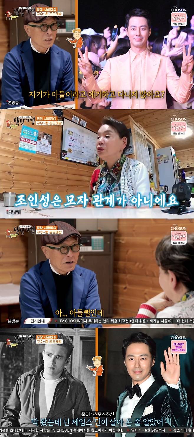 허영만은 "연예계에 그렇게 양아들이 많으시다고"라고 말했고 김수미는 신현준과 탁재훈, 장동민을 꼽았다. 이에 허영만은 "조인성 씨 돌아다니면서 자기가 아들이라고 얘기하고 다니지 않아요?"라고 묻자 김수미는 "조인성은 모자관계가 아니다. 제가 짝사랑하는 사이다"라고 답했다. "아들 뻘이다"라는 허영만에게 "손주 뻘인데 어때요 좋아하는데"라며 받아쳤다. 이어 김수미는 "제임스 딘을 좋아했다. 그런데 걔를 딱 보는데 제임스 딘이 살아 돌아온 줄 알았다"라고 말했다.