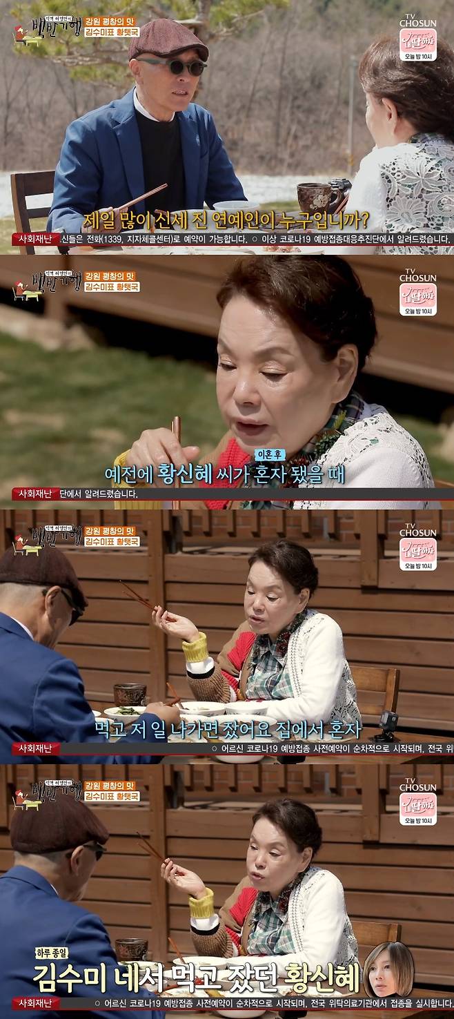 이어 허영만은 "제일 많이 신세 진 연예인이 누굽니까?"라고 물었다. 김수미는 "예전에 황신혜 씨가 혼자됐을 때 매일 아침부터 와서 아침밥부터 먹었다. 먹고 저 일 나가면 잤다. 그리고 점심도 먹고 저녁도 먹고 밤에 갔다"라고 털어놓았다.