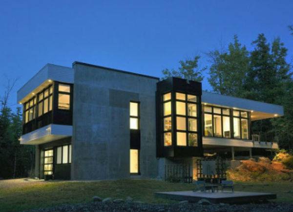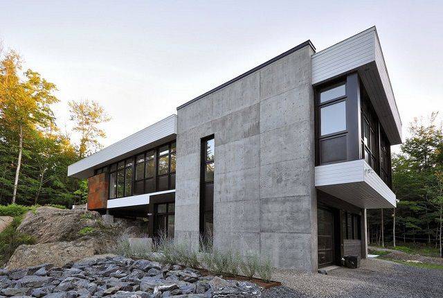 이 주택은 숲 뒤쪽 바위에 걸쳐서 지어졌다. 마치 집이 거대한 바위 위에 얹혀진 모습이다. 흰색 패널과 검정 철제, 노출콘크리트 등으로 마감한 외관과 달리 내부는 바닥부터 천장까지 백색으로 마감했다. 목재와 철제 가구로 포인트를 줬다. 주변 숲을 향해 크게 열린 창을 통해 주방과 거실에서 바깥 경관을 감상할 수 있다.