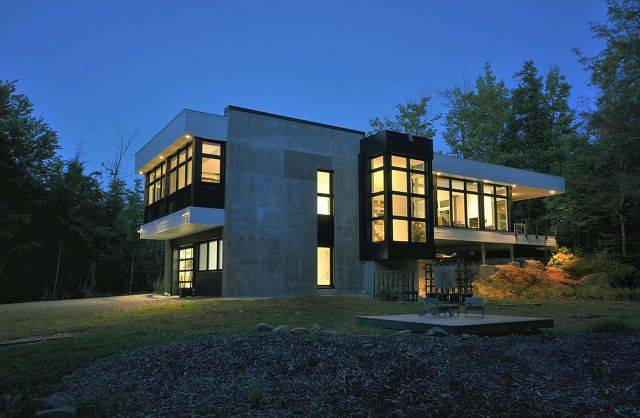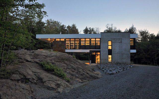 이 주택은 숲 뒤쪽 바위에 걸쳐서 지어졌다. 마치 집이 거대한 바위 위에 얹혀진 모습이다. 흰색 패널과 검정 철제, 노출콘크리트 등으로 마감한 외관과 달리 내부는 바닥부터 천장까지 백색으로 마감했다. 목재와 철제 가구로 포인트를 줬다. 주변 숲을 향해 크게 열린 창을 통해 주방과 거실에서 바깥 경관을 감상할 수 있다.