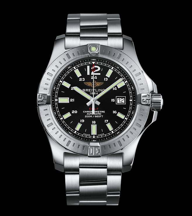 브라이틀링은 파일럿 워치를 중심으로 스포츠 워치 분야에 강점을 보여온 브랜드입니다. 그 중 콜트 컬렉션은 전통적인 브라이틀링의 크로노맷 디자인에 다이버 시계보다 조금 낮은 방수 사양을 적용한 밀리터리 워치 컨셉의 시계입니다.