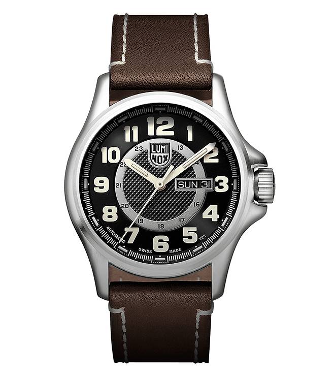루미녹스 역시 육, 해, 공으로 컨셉을 나누는데 루미녹스의 육(Land) 컨셉은 해밀턴과 조금 다릅니다. 해(Sea) 라인이 전통적인 군용 시계에 가깝고 육 라인은 좀 더 생활 밀착형 데일리 워치에 가깝습니다. 이 모델 역시 디자인을 보면 루미녹스의 전형적인 밀리터리 워치와는 상이한 디자인의 시계입니다. 43mm 스테인리스 스틸 케이스. ETA 2878 오토매틱 무브먼트. 데이-데이트. 씨스루 케이스백. 스크류 다운 크라운. 무반사코팅 사파이어 글라스. 방수 100m. 버팔로 가죽 스트랩.