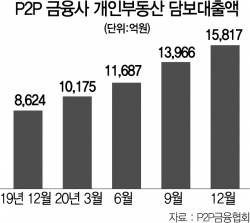 P2P 금융 업계 내 부동산 담보대출 규모도 커지고 있다. P2P금융협회에 따르면 지난해 12월 말 기준 개인을 대상으로 한 부동산 담보대출은 1조 5,817억 원에 달했다. 이는 지난 2019년 12월 말(8,624억 원)과 비교하면 2배 가까이 늘어난 수치다. 가장 많은 대출을 중개한 투게더펀딩의 경우 같은 기간 개인 부동산 담보대출액이 3,173억여 원에서 5,976억여 원까지 증가했다.