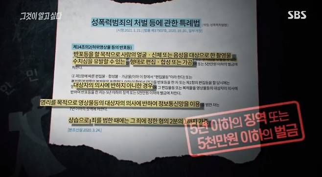지난 1월 21일부터 성폭력범죄의 처벌 등에 관한 특례법이 적용, 허위영상물 등을 반포할 시 5천만원 이하의 벌금에 처해진다. 한 변호사는 "성범죄자에게 부과하는 전자발찌, 신상정보 공개, 취업제한 등 디지털 성범죄가 성폭력 범죄로 들어왔기 때문에 피해자를 보호하는 여러 조치도 가능해진다"고 설명했다. (사진=SBS '그것이 알고싶다' 캡처)