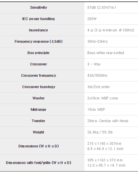 본 기는 1미터가 조금 넘는 톨보이 타입이다. 정확히는 1,162mm 높이다. 더블 우퍼를 장착한 3웨이 타입으로, 위 아래로 길게 드라이버가 배치되어 있다. 의자에 앉으면 적당히 트위터와 미드레인지를 마주할 수 있다. 무게는 약 27Kg. 그리 과하지 않다. 혼자서 이리저리 움직일 수 있는 정도다. 어떤 면에서는 좀 왜소하다고나 할까?