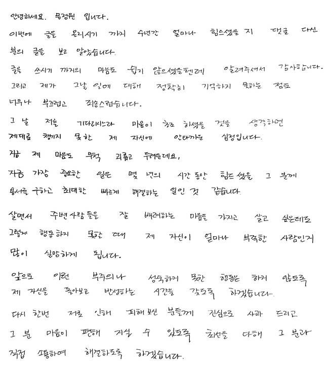 문정원 또한 자필 사과문을 통해 "그날 일에 대해 정확히 기억하지 못하는 점도 너무나 부끄럽고 죄송하다. 지금 가장 중요한 일은 몇 년의 시간 동안 힘드셨을 그분께 용서를 구하고 최대한 빠르게 해결하는 일인 것 같다"며 "살면서 주변 사람들을 잘 배려하는 마음을 가지고 살고 싶은데도 그렇게 행동하지 못할 때 제 자신이 얼마나 부족한 사람인지 많이 실망하게 된다. 앞으로 이런 부주의나 성숙하지 못한 행동은 하지 않도록 제 자신을 돌아보고 반성하는 시간을 갖겠다"고 전했다.(사진=KBS 2TV '연중 라이브' 방송 캡처, 뉴스엔DB, 문정원 소속사 제공)