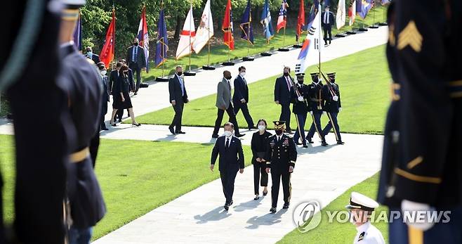 (워싱턴=연합뉴스) 최재구 기자 = 한미정상회담 참석차 미국 워싱턴을 방문중인 문재인 대통령이 20일(현지시간) 워싱턴DC인근 알링턴 국립묘지를 찾아 헌화를 위해 무명용사묘로 향하고 있다. 2021.5.20