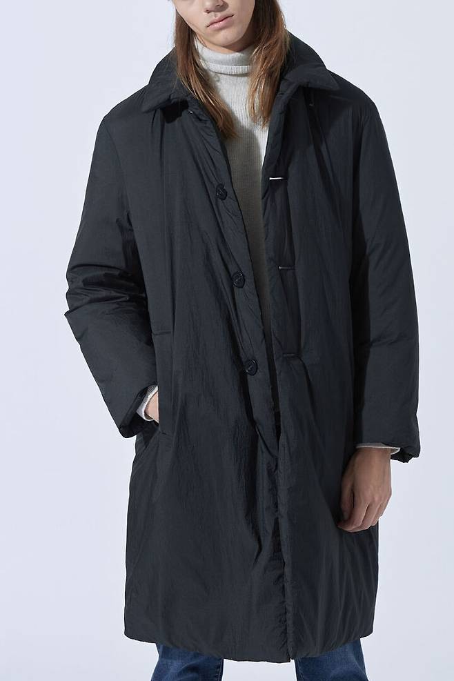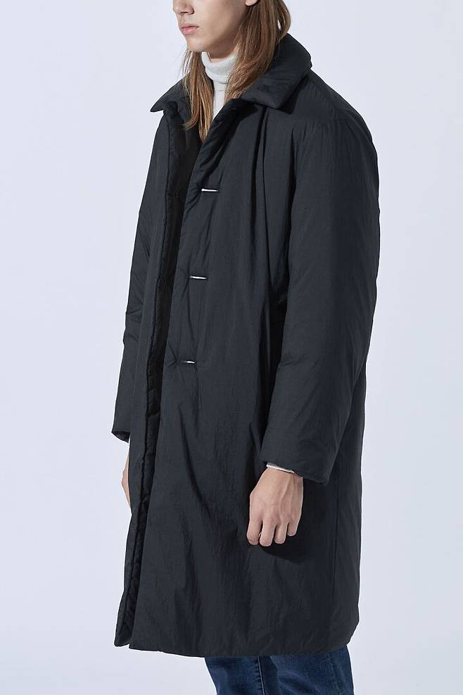 코트의 단정한 실루엣과 패딩의 보온성으로