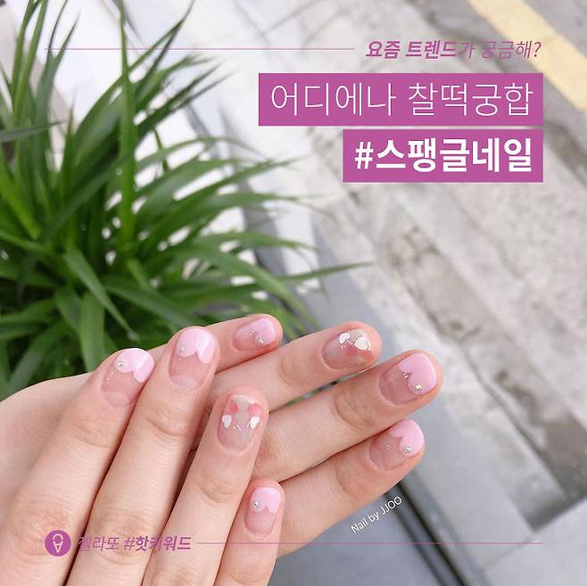 마블위에 귀여운 하트스팽글을 톡톡 올리고