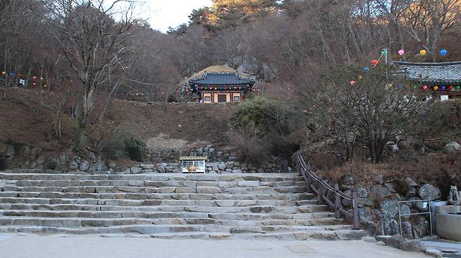석굴암 주차장에서 석굴까지는 도보로 10여 분 거리이다. 겨울이라 주변이 온통 앙상한 가지들뿐이지만 길 양쪽에 걸어둔 울긋불굿한 연등이 화려함을 더해준다. 거기다 소나무들 사이로 보일락 말락 하는 동해바다 풍경이 일품이다.