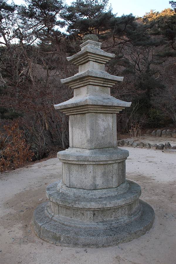 수광전 앞 마당과 종무소 건물 그 어디에도 삼층석탑의 모습은 보이지 않는다. 그러면 베일에 싸인 삼층석탑은 어디에 있을까? 삼층석탑은 해발 565m 석굴암 석굴에서 동북쪽으로 약 150m 떨어진 언덕에 위치해 있다.