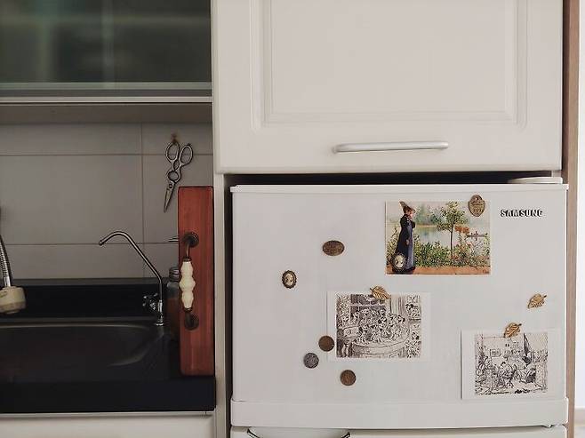 낡은 냉장고를 손쉽게 꾸미는 방법! 산책 중인 그림이 예쁘죠. 역시 칼 라손의 작품이에요. 그리고 연필선이 살아있어서 좋아하는 101마리 달마시안 컨셉 아트!