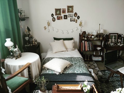 저는 어두운 목재 가구를 선호하는 편인데요, 목재의 톤을 맞추는 건 걱정보다 어렵지 않았어요. 제가 가장 좋아하는 색인 그린-블루 컬러와도 정말 잘 어울리고요. 영화 속 클래식한 분위기와 자연적인 감성을 좋아한다면 추천합니다.