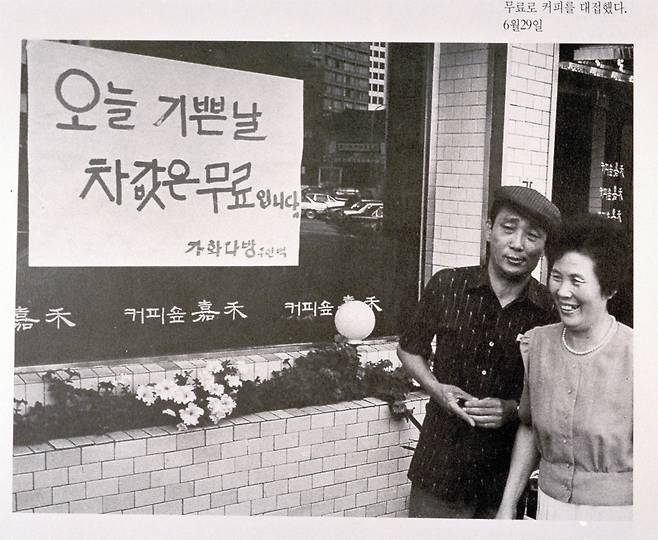 | ▲ 1987년 6월 29일, 민정당 노태우 대표위원의 6.29 선언이 있던 날 서울 북창동의 한 다방은 '오늘은 기쁜 날'이라는 환영 대자보를 유리창에 붙이고 손님들에게 무료로 커피를 대접하고 있다. |